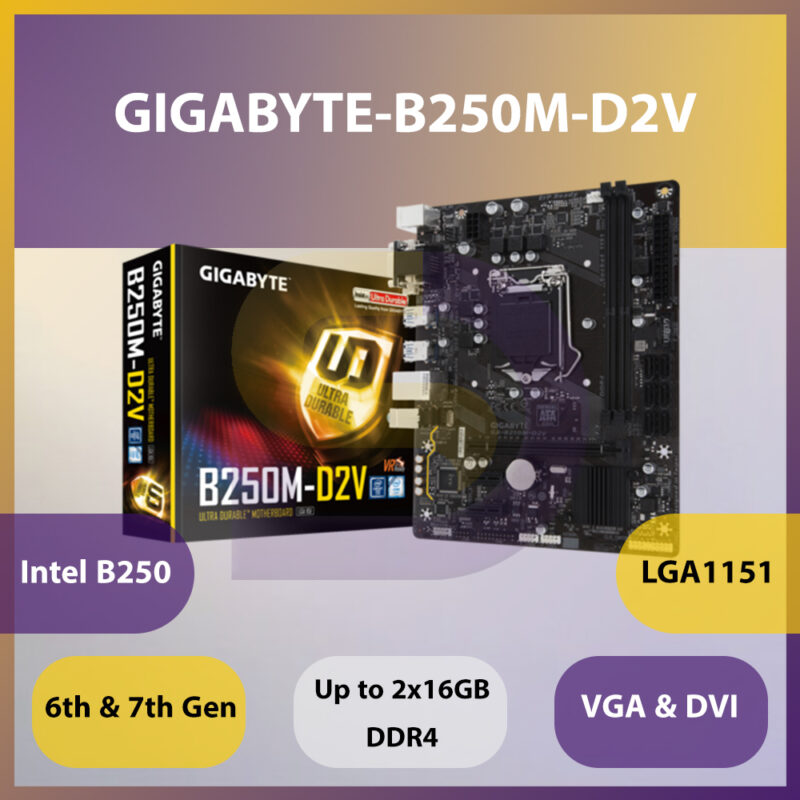 یکی از مزایای مادربرد گیگابایت Gigabyte B250-D2V پشتیبانی از پردازنده های نسل 7th/ 6th اینتل است. این مادربرد Gigabyte بر پایه پردازنده هایی با معماری 14  نانومتری (Kaby Lake processor) ساخته و چیپست این مادربرد چیپست B250 ساخت کمپانی اینتل می باشد.